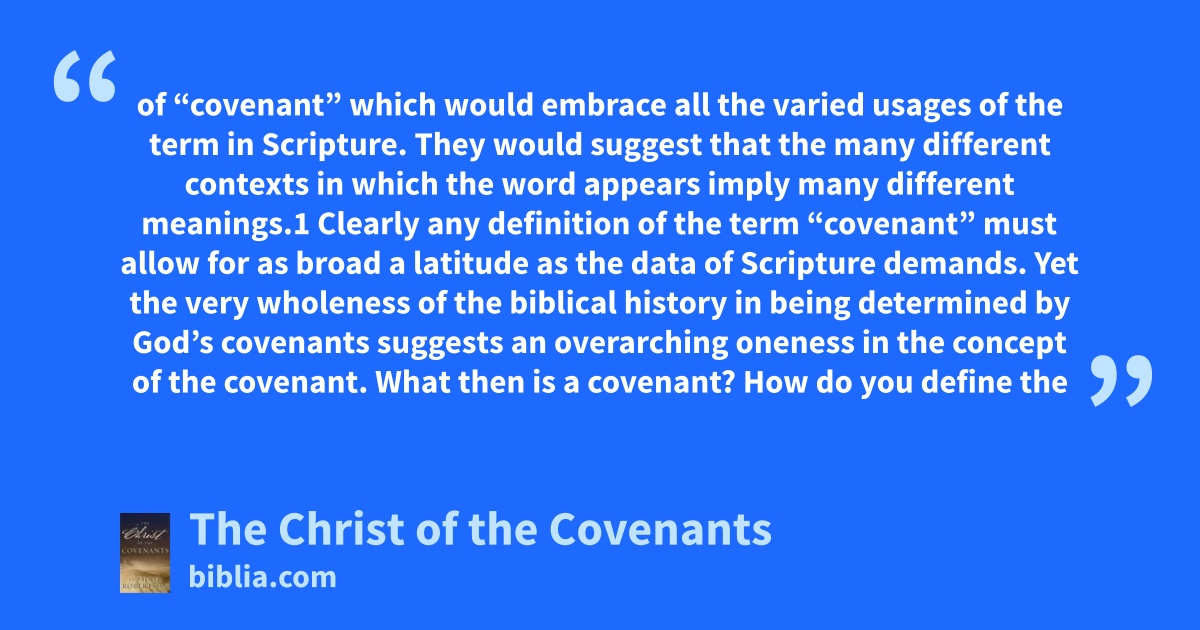 of “covenant” which would embrace all the varied usages of the term in Scripture. They would suggest that the many different contexts in which the word appears imply many different meanings.1 Clearly any definition of the term “covenant” must allow for as broad a latitude as the data of Scripture demands. Yet the very wholeness of the biblical history in being determined by God’s covenants suggests an overarching oneness in the concept of the covenant. What then is a covenant? How do you define the