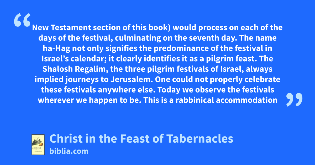 New Testament section of this book) would process on each of the days of the festival, culminating on the seventh day. The name ha-Hag not only signifies the predominance of the festival in Israel’s calendar; it clearly identifies it as a pilgrim feast. The Shalosh Regalim, the three pilgrim festivals of Israel, always implied journeys to Jerusalem. One could not properly celebrate these festivals anywhere else. Today we observe the festivals wherever we happen to be. This is a rabbinical accommodation