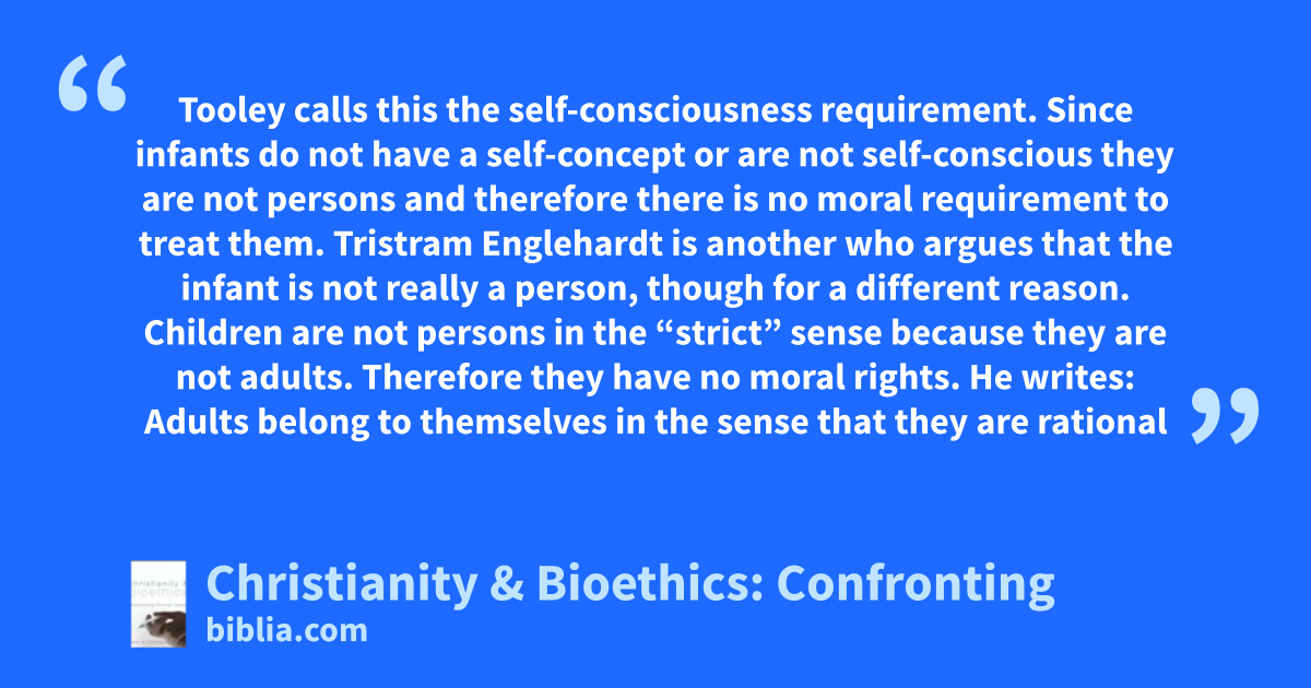 Tooley calls this the self-consciousness requirement. Since infants do not have a self-concept or are not self-conscious they are not persons and therefore there is no moral requirement to treat them. Tristram Englehardt is another who argues that the infant is not really a person, though for a different reason. Children are not persons in the “strict” sense because they are not adults. Therefore they have no moral rights. He writes: Adults belong to themselves in the sense that they are rational