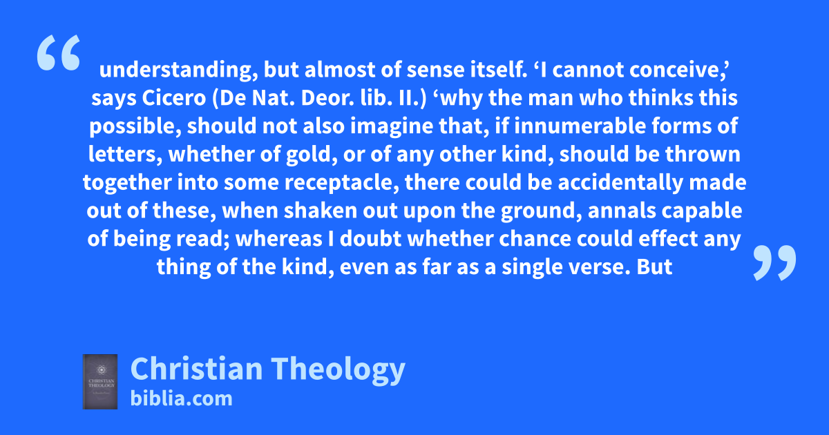 understanding, but almost of sense itself. ‘I cannot conceive,’ says Cicero (De Nat. Deor. lib. II.) ‘why the man who thinks this possible, should not also imagine that, if innumerable forms of letters, whether of gold, or of any other kind, should be thrown together into some receptacle, there could be accidentally made out of these, when shaken out upon the ground, annals capable of being read; whereas I doubt whether chance could effect any thing of the kind, even as far as a single verse. But