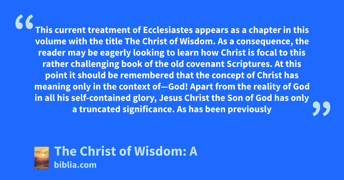 This current treatment of Ecclesiastes appears as a chapter in this volume with the title The Christ of Wisdom. As a consequence, the reader may be eagerly looking to learn how Christ is focal to this rather challenging book of the old covenant Scriptures. At this point it should be remembered that the concept of Christ has meaning only in the context of—God! Apart from the reality of God in all his self-contained glory, Jesus Christ the Son of God has only a truncated significance. As has been previously