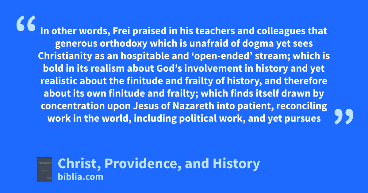 In other words, Frei praised in his teachers and colleagues that generous orthodoxy which is unafraid of dogma yet sees Christianity as an hospitable and ‘open-ended’ stream; which is bold in its realism about God’s involvement in history and yet realistic about the finitude and frailty of history, and therefore about its own finitude and frailty; which finds itself drawn by concentration upon Jesus of Nazareth into patient, reconciling work in the world, including political work, and yet pursues