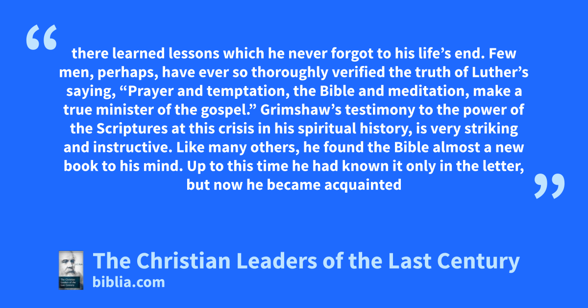 there learned lessons which he never forgot to his life’s end. Few men, perhaps, have ever so thoroughly verified the truth of Luther’s saying, “Prayer and temptation, the Bible and meditation, make a true minister of the gospel.” Grimshaw’s testimony to the power of the Scriptures at this crisis in his spiritual history, is very striking and instructive. Like many others, he found the Bible almost a new book to his mind. Up to this time he had known it only in the letter, but now he became acquainted