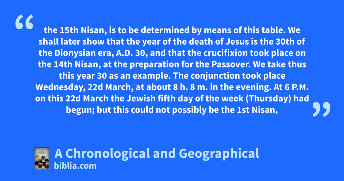 the 15th Nisan, is to be determined by means of this table. We shall later show that the year of the death of Jesus is the 30th of the Dionysian era, A.D. 30, and that the crucifixion took place on the 14th Nisan, at the preparation for the Passover. We take thus this year 30 as an example. The conjunction took place Wednesday, 22d March, at about 8 h. 8 m. in the evening. At 6 P.M. on this 22d March the Jewish fifth day of the week (Thursday) had begun; but this could not possibly be the 1st Nisan,