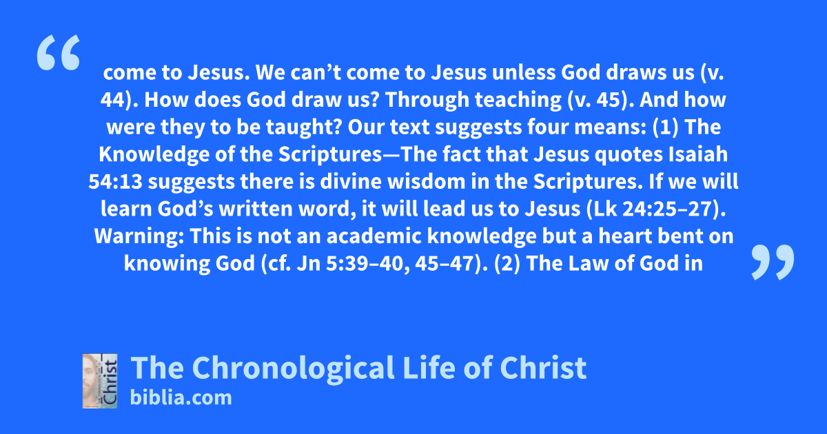 come to Jesus. We can’t come to Jesus unless God draws us (v. 44). How does God draw us? Through teaching (v. 45). And how were they to be taught? Our text suggests four means: (1) The Knowledge of the Scriptures—The fact that Jesus quotes Isaiah 54:13 suggests there is divine wisdom in the Scriptures. If we will learn God’s written word, it will lead us to Jesus (Lk 24:25–27). Warning: This is not an academic knowledge but a heart bent on knowing God (cf. Jn 5:39–40, 45–47). (2) The Law of God in