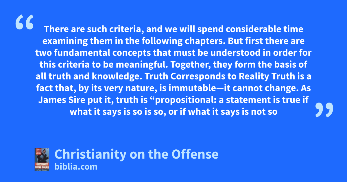 There are such criteria, and we will spend considerable time examining them in the following chapters. But first there are two fundamental concepts that must be understood in order for this criteria to be meaningful. Together, they form the basis of all truth and knowledge. Truth Corresponds to Reality Truth is a fact that, by its very nature, is immutable—it cannot change. As James Sire put it, truth is “propositional: a statement is true if what it says is so is so, or if what it says is not so