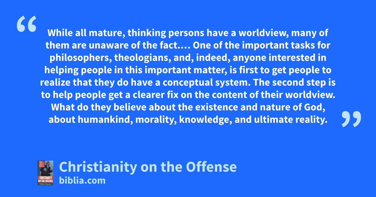 While all mature, thinking persons have a worldview, many of them are unaware of the fact.… One of the important tasks for philosophers, theologians, and, indeed, anyone interested in helping people in this important matter, is first to get people to realize that they do have a conceptual system. The second step is to help people get a clearer fix on the content of their worldview. What do they believe about the existence and nature of God, about humankind, morality, knowledge, and ultimate reality.