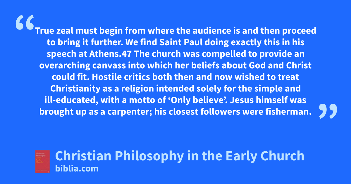 True zeal must begin from where the audience is and then proceed to bring it further. We find Saint Paul doing exactly this in his speech at Athens.47 The church was compelled to provide an overarching canvass into which her beliefs about God and Christ could fit. Hostile critics both then and now wished to treat Christianity as a religion intended solely for the simple and ill-educated, with a motto of ‘Only believe’. Jesus himself was brought up as a carpenter; his closest followers were fisherman.