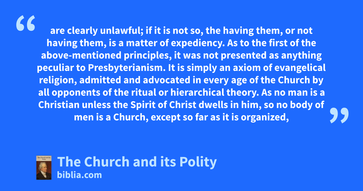 are clearly unlawful; if it is not so, the having them, or not having them, is a matter of expediency. As to the first of the above-mentioned principles, it was not presented as anything peculiar to Presbyterianism. It is simply an axiom of evangelical religion, admitted and advocated in every age of the Church by all opponents of the ritual or hierarchical theory. As no man is a Christian unless the Spirit of Christ dwells in him, so no body of men is a Church, except so far as it is organized,