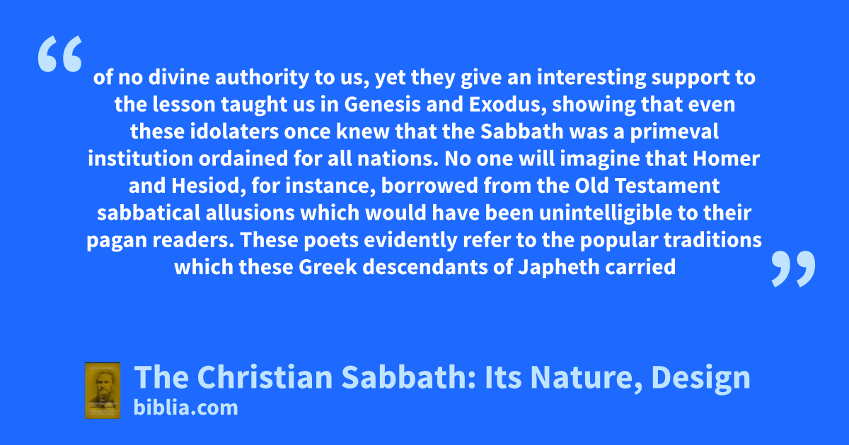 of no divine authority to us, yet they give an interesting support to the lesson taught us in Genesis and Exodus, showing that even these idolaters once knew that the Sabbath was a primeval institution ordained for all nations. No one will imagine that Homer and Hesiod, for instance, borrowed from the Old Testament sabbatical allusions which would have been unintelligible to their pagan readers. These poets evidently refer to the popular traditions which these Greek descendants of Japheth carried
