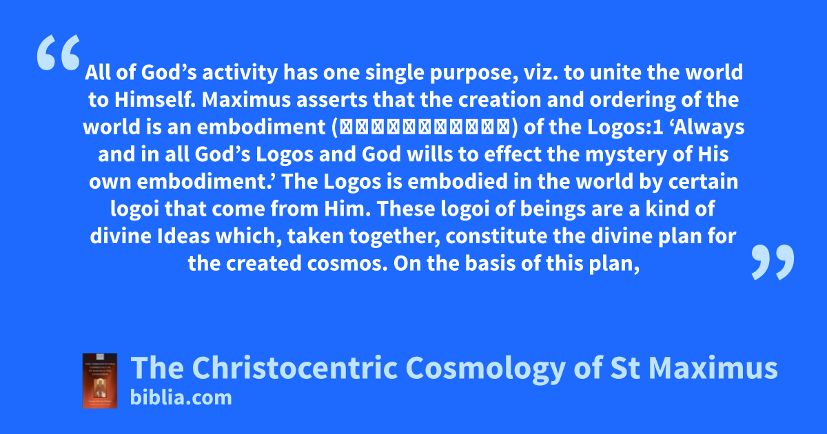 All of God’s activity has one single purpose, viz. to unite the world to Himself. Maximus asserts that the creation and ordering of the world is an embodiment (ἐνσωμάτωσις) of the Logos:1 ‘Always and in all God’s Logos and God wills to effect the mystery of His own embodiment.’ The Logos is embodied in the world by certain logoi that come from Him. These logoi of beings are a kind of divine Ideas which, taken together, constitute the divine plan for the created cosmos. On the basis of this plan,