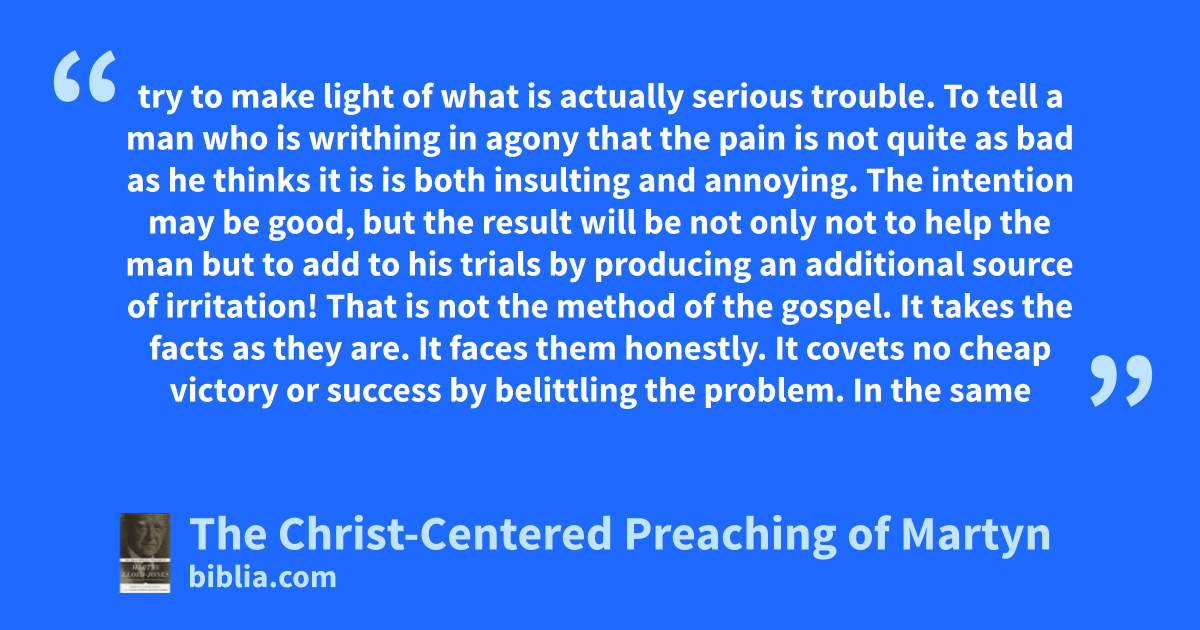 try to make light of what is actually serious trouble. To tell a man who is writhing in agony that the pain is not quite as bad as he thinks it is is both insulting and annoying. The intention may be good, but the result will be not only not to help the man but to add to his trials by producing an additional source of irritation! That is not the method of the gospel. It takes the facts as they are. It faces them honestly. It covets no cheap victory or success by belittling the problem. In the same