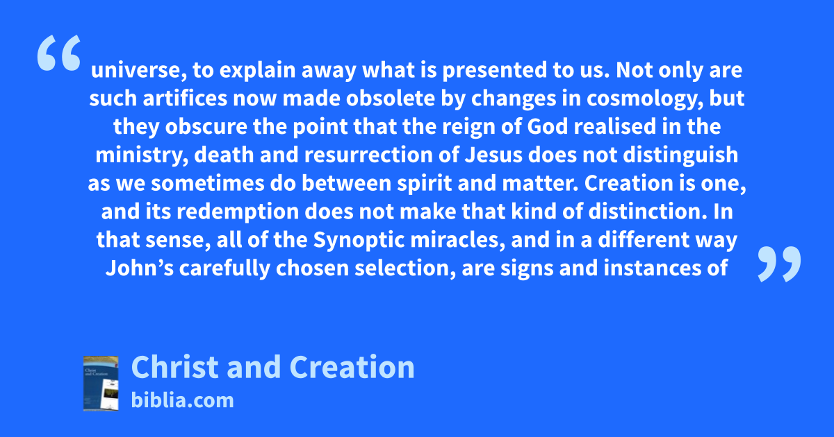 universe, to explain away what is presented to us. Not only are such artifices now made obsolete by changes in cosmology, but they obscure the point that the reign of God realised in the ministry, death and resurrection of Jesus does not distinguish as we sometimes do between spirit and matter. Creation is one, and its redemption does not make that kind of distinction. In that sense, all of the Synoptic miracles, and in a different way John’s carefully chosen selection, are signs and instances of