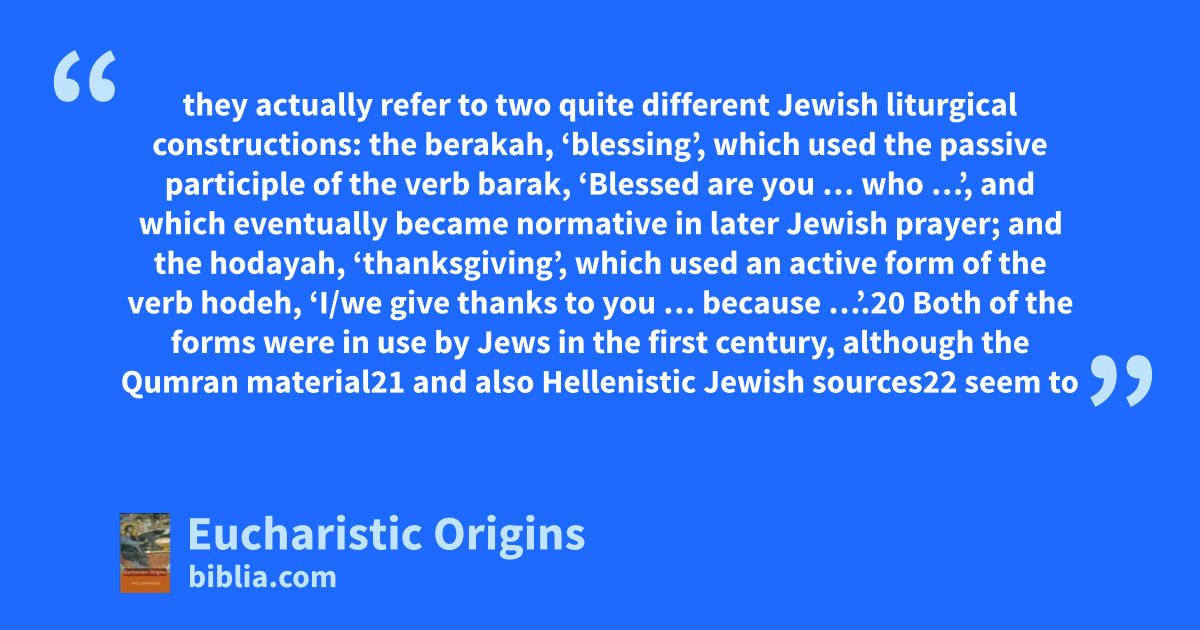 they actually refer to two quite different Jewish liturgical constructions: the berakah, ‘blessing’, which used the passive participle of the verb barak, ‘Blessed are you … who …’, and which eventually became normative in later Jewish prayer; and the hodayah, ‘thanksgiving’, which used an active form of the verb hodeh, ‘I/we give thanks to you … because …’.20 Both of the forms were in use by Jews in the first century, although the Qumran material21 and also Hellenistic Jewish sources22 seem to