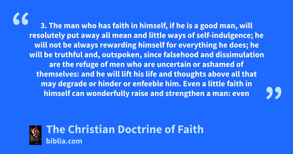 3. The man who has faith in himself, if he is a good man, will resolutely put away all mean and little ways of self-indulgence; he will not be always rewarding himself for everything he does; he will be truthful and, outspoken, since falsehood and dissimulation are the refuge of men who are uncertain or ashamed of themselves: and he will lift his life and thoughts above all that may degrade or hinder or enfeeble him. Even a little faith in himself can wonderfully raise and strengthen a man: even