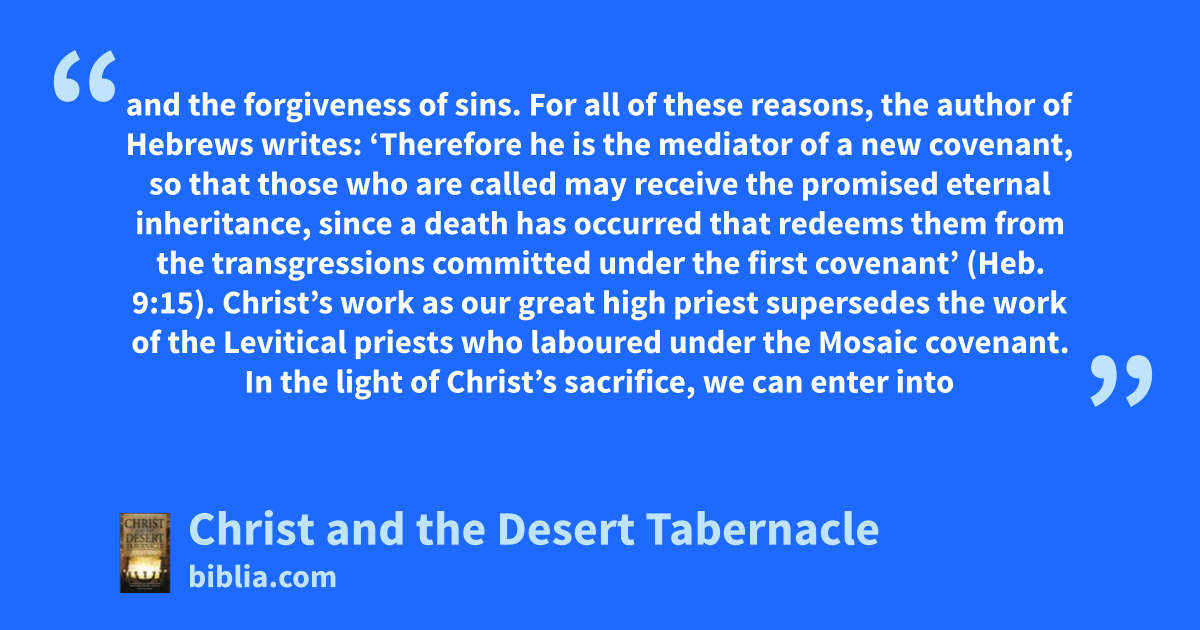 and the forgiveness of sins. For all of these reasons, the author of Hebrews writes: ‘Therefore he is the mediator of a new covenant, so that those who are called may receive the promised eternal inheritance, since a death has occurred that redeems them from the transgressions committed under the first covenant’ (Heb. 9:15). Christ’s work as our great high priest supersedes the work of the Levitical priests who laboured under the Mosaic covenant. In the light of Christ’s sacrifice, we can enter into