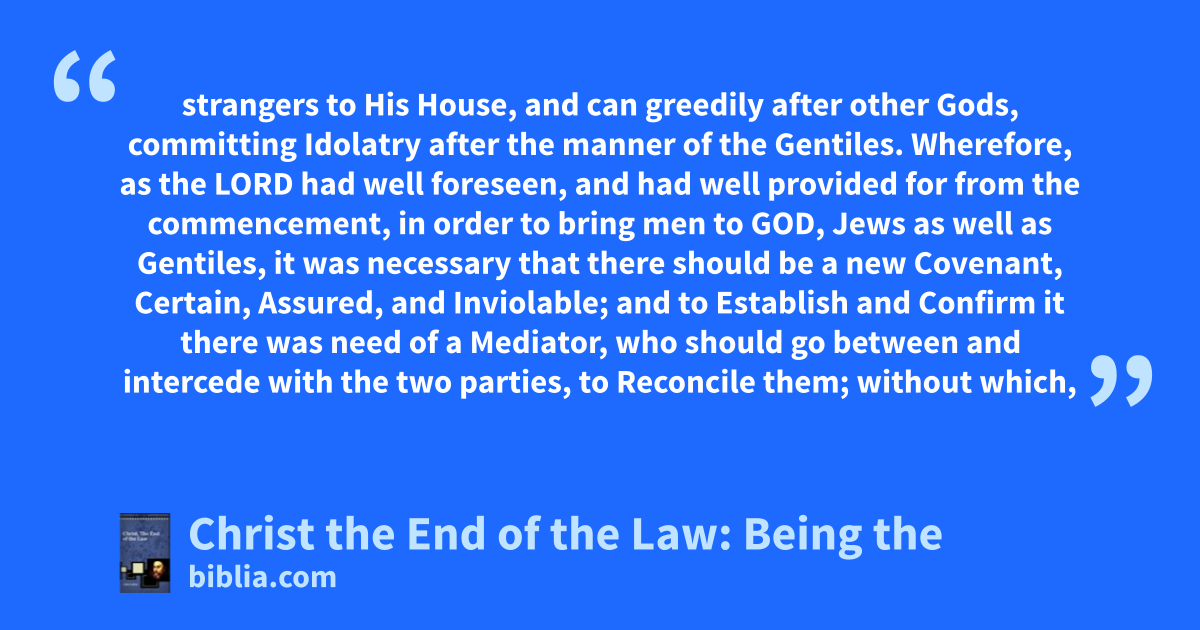 strangers to His House, and can greedily after other Gods, committing Idolatry after the manner of the Gentiles. Wherefore, as the LORD had well foreseen, and had well provided for from the commencement, in order to bring men to GOD, Jews as well as Gentiles, it was necessary that there should be a new Covenant, Certain, Assured, and Inviolable; and to Establish and Confirm it there was need of a Mediator, who should go between and intercede with the two parties, to Reconcile them; without which,