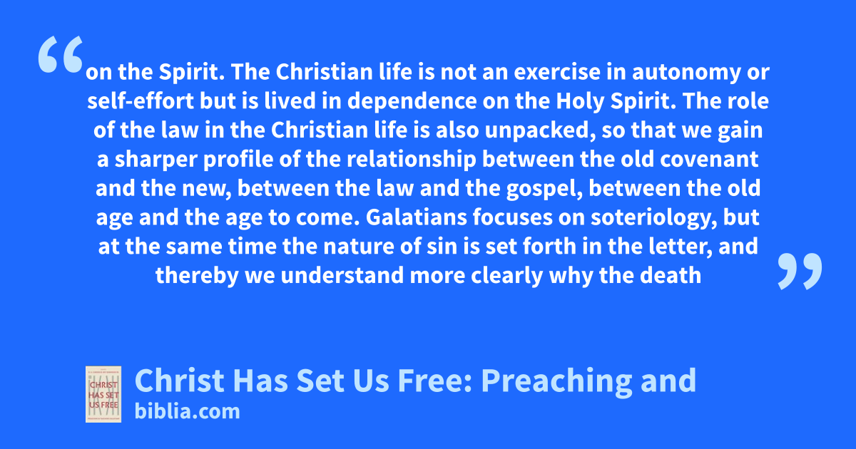 on the Spirit. The Christian life is not an exercise in autonomy or self-effort but is lived in dependence on the Holy Spirit. The role of the law in the Christian life is also unpacked, so that we gain a sharper profile of the relationship between the old covenant and the new, between the law and the gospel, between the old age and the age to come. Galatians focuses on soteriology, but at the same time the nature of sin is set forth in the letter, and thereby we understand more clearly why the death