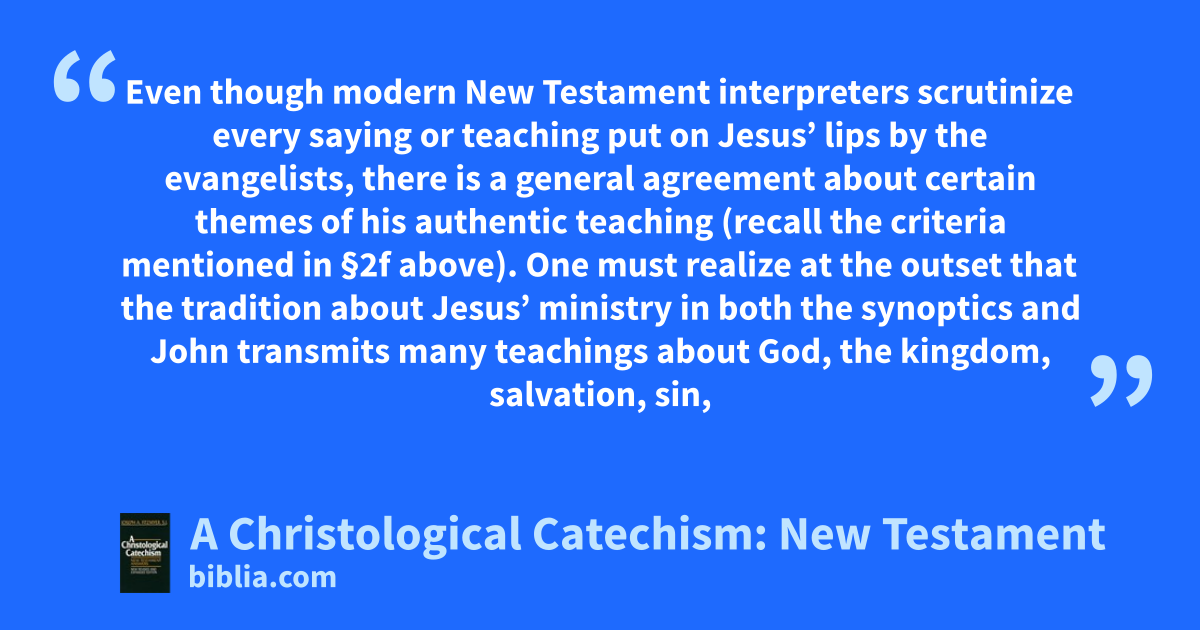 Even though modern New Testament interpreters scrutinize every saying or teaching put on Jesus’ lips by the evangelists, there is a general agreement about certain themes of his authentic teaching (recall the criteria mentioned in §2f above). One must realize at the outset that the tradition about Jesus’ ministry in both the synoptics and John transmits many teachings about God, the kingdom, salvation, sin,