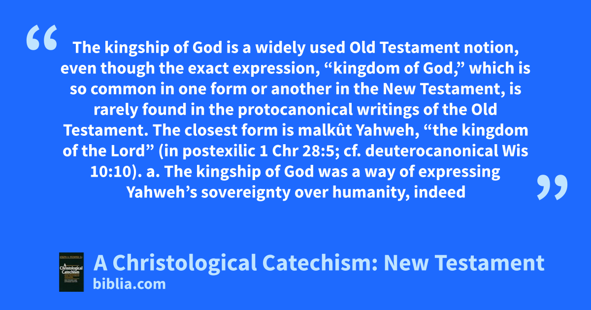 The kingship of God is a widely used Old Testament notion, even though the exact expression, “kingdom of God,” which is so common in one form or another in the New Testament, is rarely found in the protocanonical writings of the Old Testament. The closest form is malkût Yahweh, “the kingdom of the Lord” (in postexilic 1 Chr 28:5; cf. deuterocanonical Wis 10:10). a. The kingship of God was a way of expressing Yahweh’s sovereignty over humanity, indeed