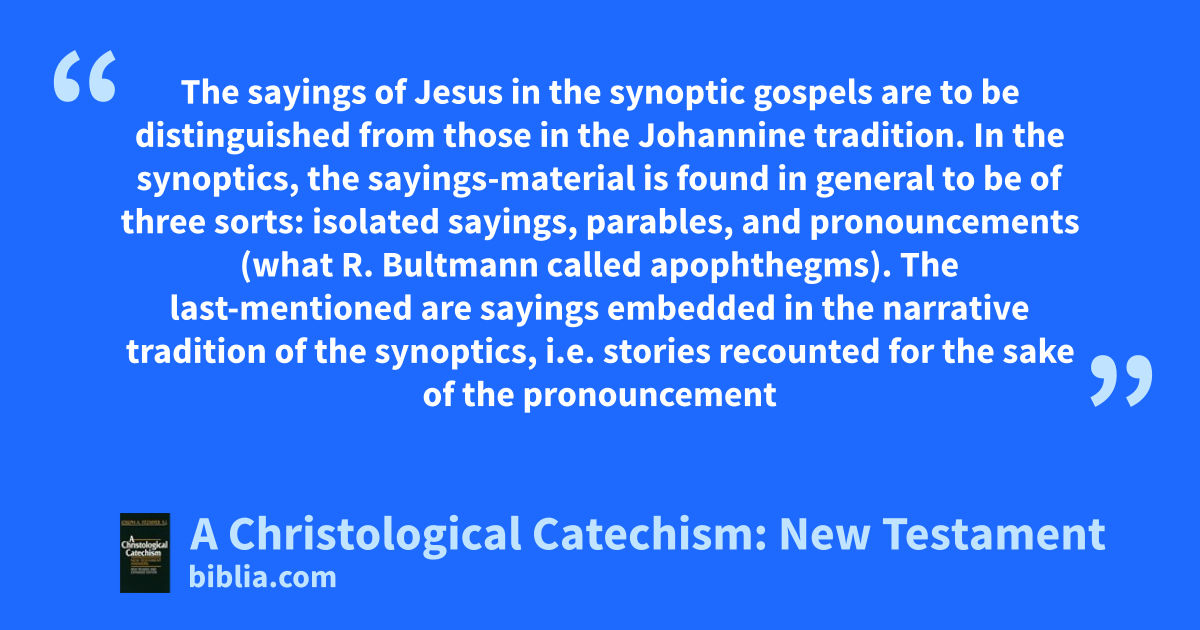 The sayings of Jesus in the synoptic gospels are to be distinguished from those in the Johannine tradition. In the synoptics, the sayings-material is found in general to be of three sorts: isolated sayings, parables, and pronouncements (what R. Bultmann called apophthegms). The last-mentioned are sayings embedded in the narrative tradition of the synoptics, i.e. stories recounted for the sake of the pronouncement