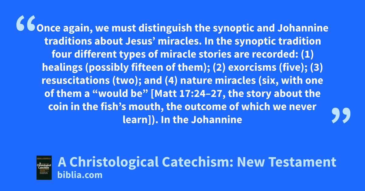 Once again, we must distinguish the synoptic and Johannine traditions about Jesus’ miracles. In the synoptic tradition four different types of miracle stories are recorded: (1) healings (possibly fifteen of them); (2) exorcisms (five); (3) resuscitations (two); and (4) nature miracles (six, with one of them a “would be” [Matt 17:24–27, the story about the coin in the fish’s mouth, the outcome of which we never learn]). In the Johannine