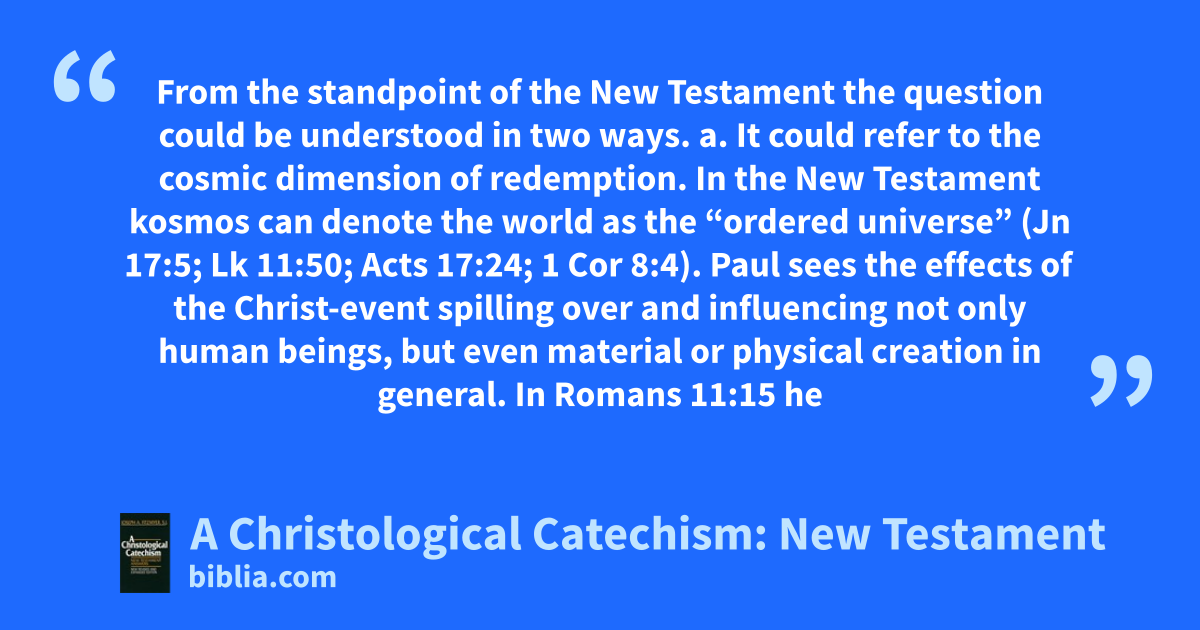 From the standpoint of the New Testament the question could be understood in two ways. a. It could refer to the cosmic dimension of redemption. In the New Testament kosmos can denote the world as the “ordered universe” (Jn 17:5; Lk 11:50; Acts 17:24; 1 Cor 8:4). Paul sees the effects of the Christ-event spilling over and influencing not only human beings, but even material or physical creation in general. In Romans 11:15 he