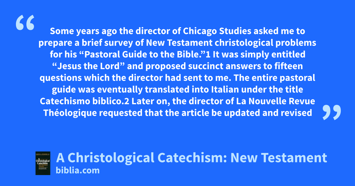 Some years ago the director of Chicago Studies asked me to prepare a brief survey of New Testament christological problems for his “Pastoral Guide to the Bible.”1 It was simply entitled “Jesus the Lord” and proposed succinct answers to fifteen questions which the director had sent to me. The entire pastoral guide was eventually translated into Italian under the title Catechismo biblico.2 Later on, the director of La Nouvelle Revue Théologique requested that the article be updated and revised