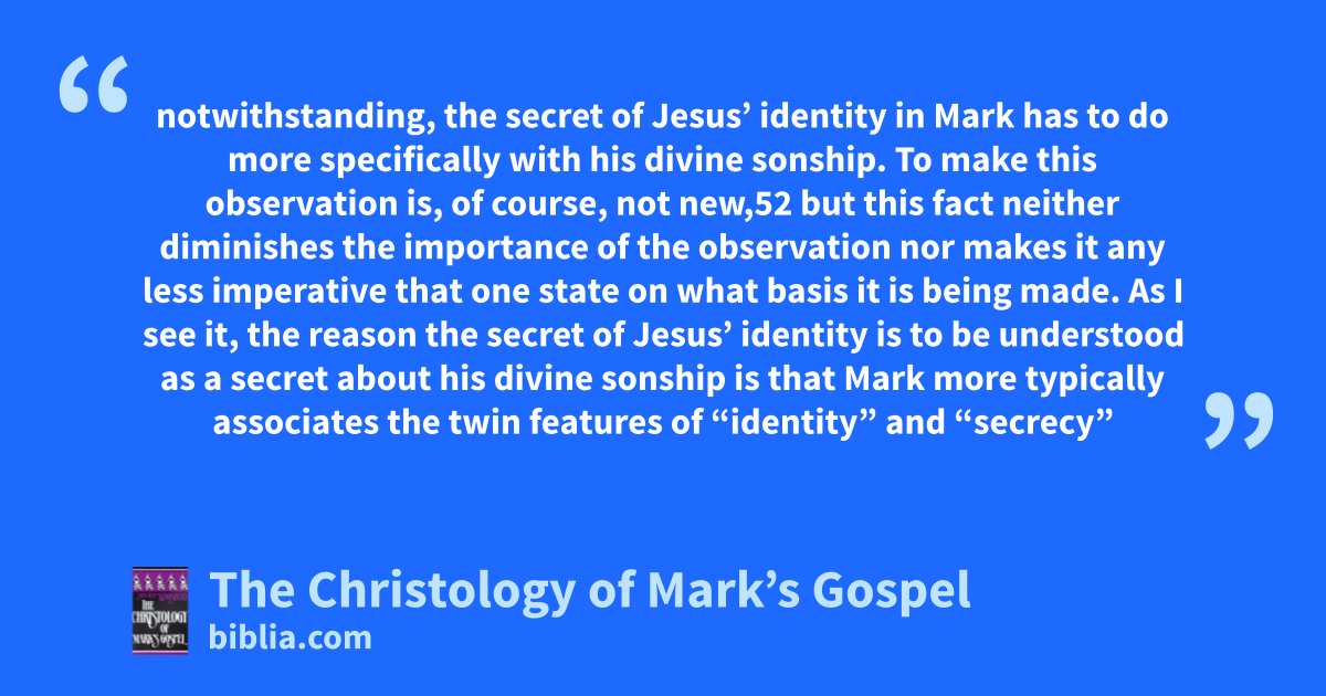 notwithstanding, the secret of Jesus’ identity in Mark has to do more specifically with his divine sonship. To make this observation is, of course, not new,52 but this fact neither diminishes the importance of the observation nor makes it any less imperative that one state on what basis it is being made. As I see it, the reason the secret of Jesus’ identity is to be understood as a secret about his divine sonship is that Mark more typically associates the twin features of “identity” and “secrecy”