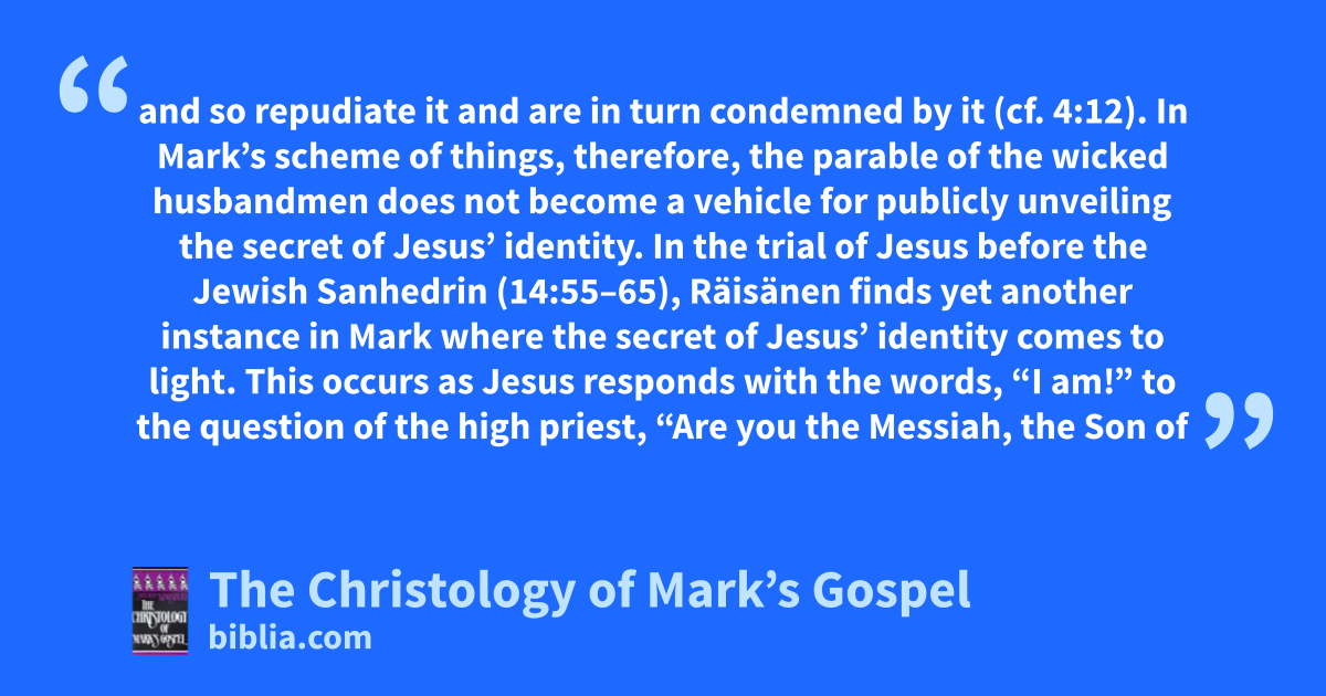 and so repudiate it and are in turn condemned by it (cf. 4:12). In Mark’s scheme of things, therefore, the parable of the wicked husbandmen does not become a vehicle for publicly unveiling the secret of Jesus’ identity. In the trial of Jesus before the Jewish Sanhedrin (14:55–65), Räisänen finds yet another instance in Mark where the secret of Jesus’ identity comes to light. This occurs as Jesus responds with the words, “I am!” to the question of the high priest, “Are you the Messiah, the Son of