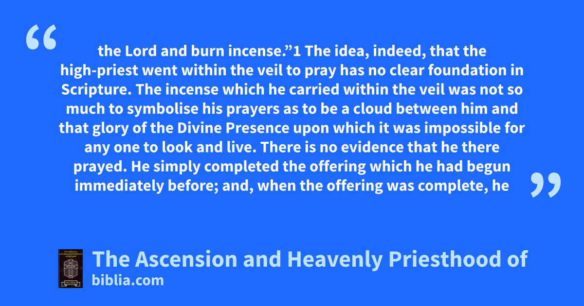 the Lord and burn incense.”1 The idea, indeed, that the high-priest went within the veil to pray has no clear foundation in Scripture. The incense which he carried within the veil was not so much to symbolise his prayers as to be a cloud between him and that glory of the Divine Presence upon which it was impossible for any one to look and live. There is no evidence that he there prayed. He simply completed the offering which he had begun immediately before; and, when the offering was complete, he