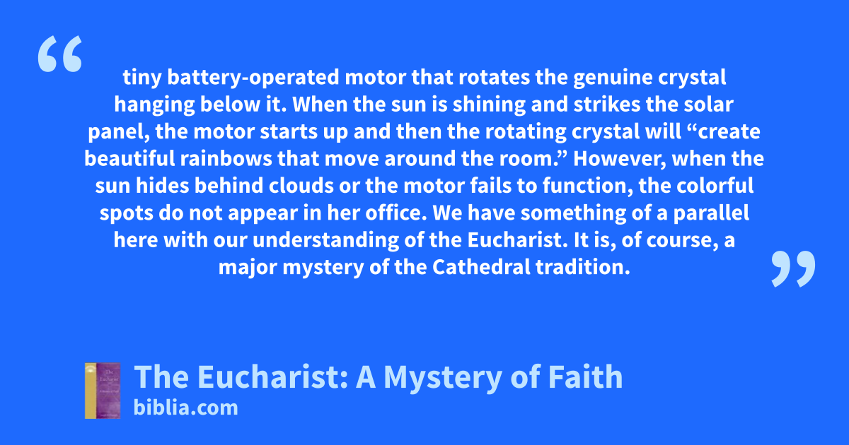 tiny battery-operated motor that rotates the genuine crystal hanging below it. When the sun is shining and strikes the solar panel, the motor starts up and then the rotating crystal will “create beautiful rainbows that move around the room.” However, when the sun hides behind clouds or the motor fails to function, the colorful spots do not appear in her office. We have something of a parallel here with our understanding of the Eucharist. It is, of course, a major mystery of the Cathedral tradition.