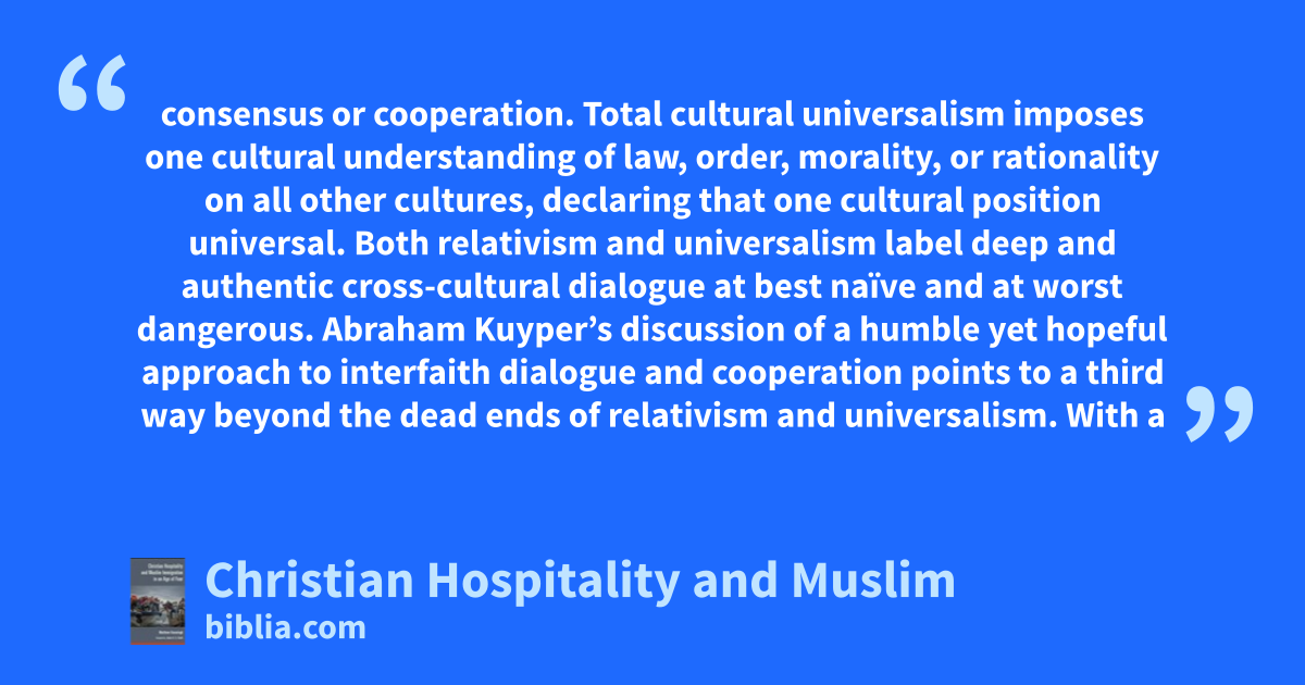 consensus or cooperation. Total cultural universalism imposes one cultural understanding of law, order, morality, or rationality on all other cultures, declaring that one cultural position universal. Both relativism and universalism label deep and authentic cross-cultural dialogue at best naïve and at worst dangerous. Abraham Kuyper’s discussion of a humble yet hopeful approach to interfaith dialogue and cooperation points to a third way beyond the dead ends of relativism and universalism. With a