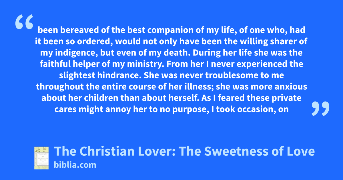 been bereaved of the best companion of my life, of one who, had it been so ordered, would not only have been the willing sharer of my indigence, but even of my death. During her life she was the faithful helper of my ministry. From her I never experienced the slightest hindrance. She was never troublesome to me throughout the entire course of her illness; she was more anxious about her children than about herself. As I feared these private cares might annoy her to no purpose, I took occasion, on