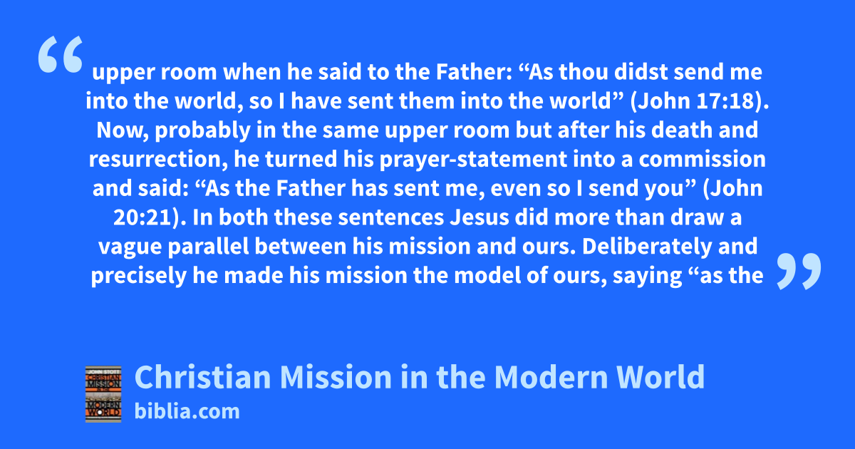 upper room when he said to the Father: “As thou didst send me into the world, so I have sent them into the world” (John 17:18). Now, probably in the same upper room but after his death and resurrection, he turned his prayer-statement into a commission and said: “As the Father has sent me, even so I send you” (John 20:21). In both these sentences Jesus did more than draw a vague parallel between his mission and ours. Deliberately and precisely he made his mission the model of ours, saying “as the