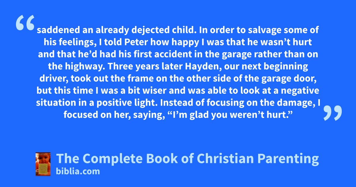saddened an already dejected child. In order to salvage some of his feelings, I told Peter how happy I was that he wasn’t hurt and that he’d had his first accident in the garage rather than on the highway. Three years later Hayden, our next beginning driver, took out the frame on the other side of the garage door, but this time I was a bit wiser and was able to look at a negative situation in a positive light. Instead of focusing on the damage, I focused on her, saying, “I’m glad you weren’t hurt.”