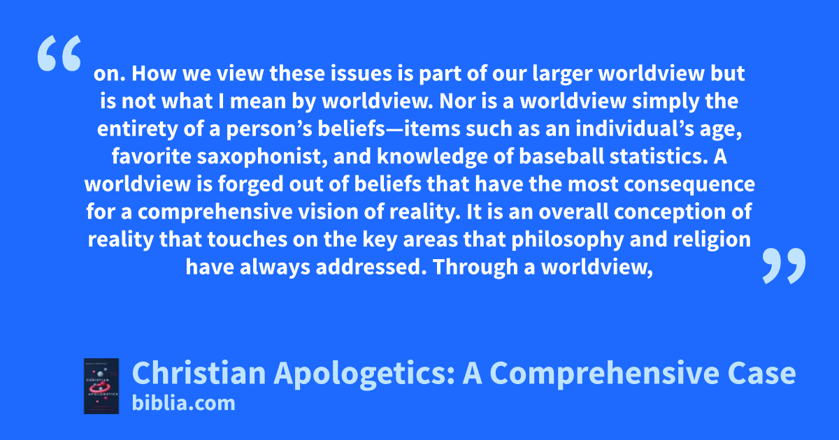 on. How we view these issues is part of our larger worldview but is not what I mean by worldview. Nor is a worldview simply the entirety of a person’s beliefs—items such as an individual’s age, favorite saxophonist, and knowledge of baseball statistics. A worldview is forged out of beliefs that have the most consequence for a comprehensive vision of reality. It is an overall conception of reality that touches on the key areas that philosophy and religion have always addressed. Through a worldview,