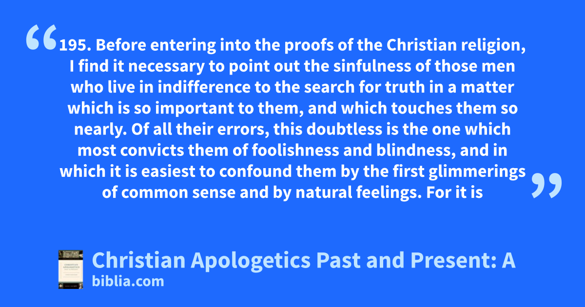 195. Before entering into the proofs of the Christian religion, I find it necessary to point out the sinfulness of those men who live in indifference to the search for truth in a matter which is so important to them, and which touches them so nearly. Of all their errors, this doubtless is the one which most convicts them of foolishness and blindness, and in which it is easiest to confound them by the first glimmerings of common sense and by natural feelings. For it is