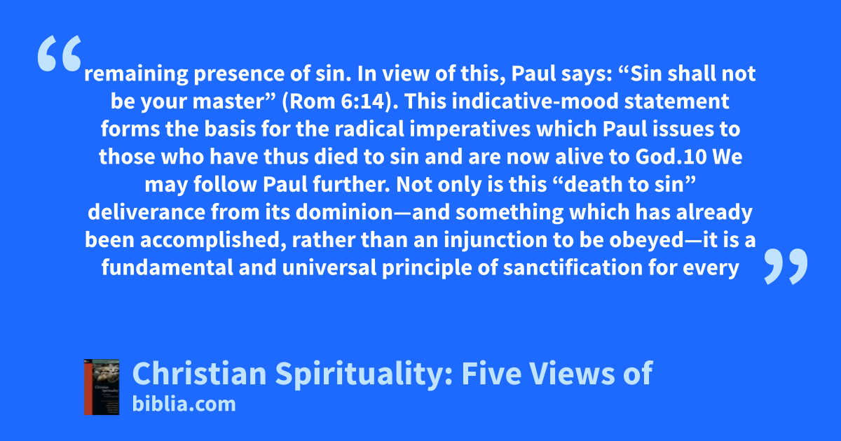remaining presence of sin. In view of this, Paul says: “Sin shall not be your master” (Rom 6:14). This indicative-mood statement forms the basis for the radical imperatives which Paul issues to those who have thus died to sin and are now alive to God.10 We may follow Paul further. Not only is this “death to sin” deliverance from its dominion—and something which has already been accomplished, rather than an injunction to be obeyed—it is a fundamental and universal principle of sanctification for every