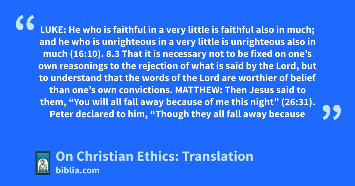 LUKE: He who is faithful in a very little is faithful also in much; and he who is unrighteous in a very little is unrighteous also in much (16:10). 8.3 That it is necessary not to be fixed on one’s own reasonings to the rejection of what is said by the Lord, but to understand that the words of the Lord are worthier of belief than one’s own convictions. MATTHEW: Then Jesus said to them, “You will all fall away because of me this night” (26:31). Peter declared to him, “Though they all fall away because