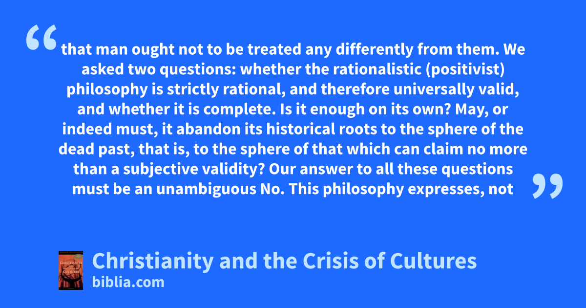 that man ought not to be treated any differently from them. We asked two questions: whether the rationalistic (positivist) philosophy is strictly rational, and therefore universally valid, and whether it is complete. Is it enough on its own? May, or indeed must, it abandon its historical roots to the sphere of the dead past, that is, to the sphere of that which can claim no more than a subjective validity? Our answer to all these questions must be an unambiguous No. This philosophy expresses, not