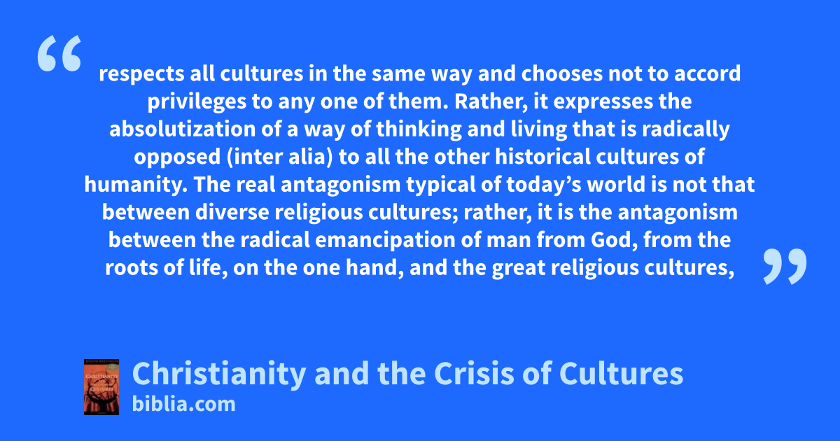 respects all cultures in the same way and chooses not to accord privileges to any one of them. Rather, it expresses the absolutization of a way of thinking and living that is radically opposed (inter alia) to all the other historical cultures of humanity. The real antagonism typical of today’s world is not that between diverse religious cultures; rather, it is the antagonism between the radical emancipation of man from God, from the roots of life, on the one hand, and the great religious cultures,