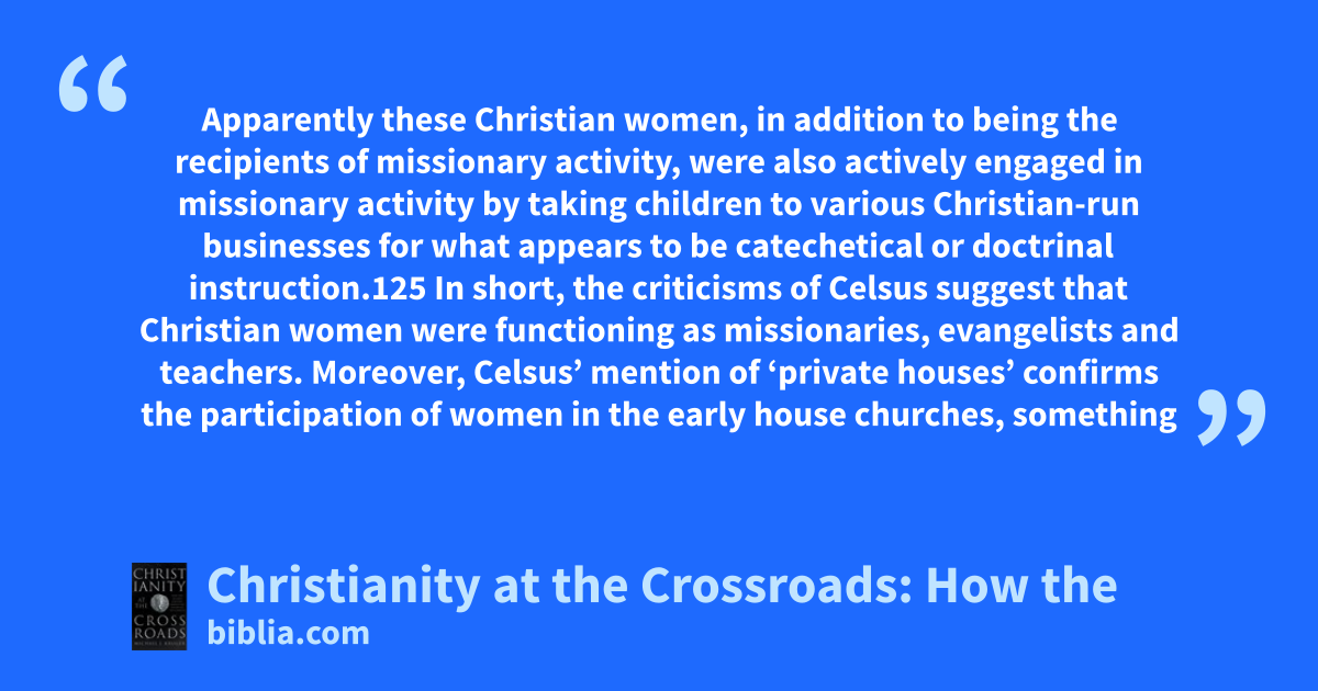 Apparently these Christian women, in addition to being the recipients of missionary activity, were also actively engaged in missionary activity by taking children to various Christian-run businesses for what appears to be catechetical or doctrinal instruction.125 In short, the criticisms of Celsus suggest that Christian women were functioning as missionaries, evangelists and teachers. Moreover, Celsus’ mention of ‘private houses’ confirms the participation of women in the early house churches, something
