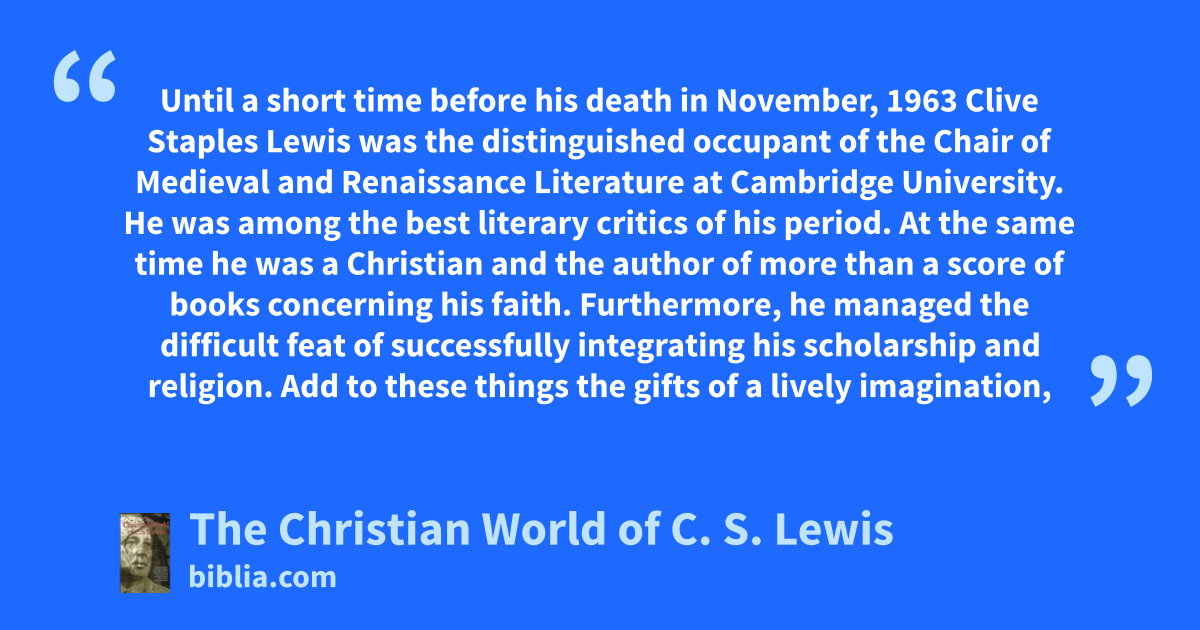 Until a short time before his death in November, 1963 Clive Staples Lewis was the distinguished occupant of the Chair of Medieval and Renaissance Literature at Cambridge University. He was among the best literary critics of his period. At the same time he was a Christian and the author of more than a score of books concerning his faith. Furthermore, he managed the difficult feat of successfully integrating his scholarship and religion. Add to these things the gifts of a lively imagination,