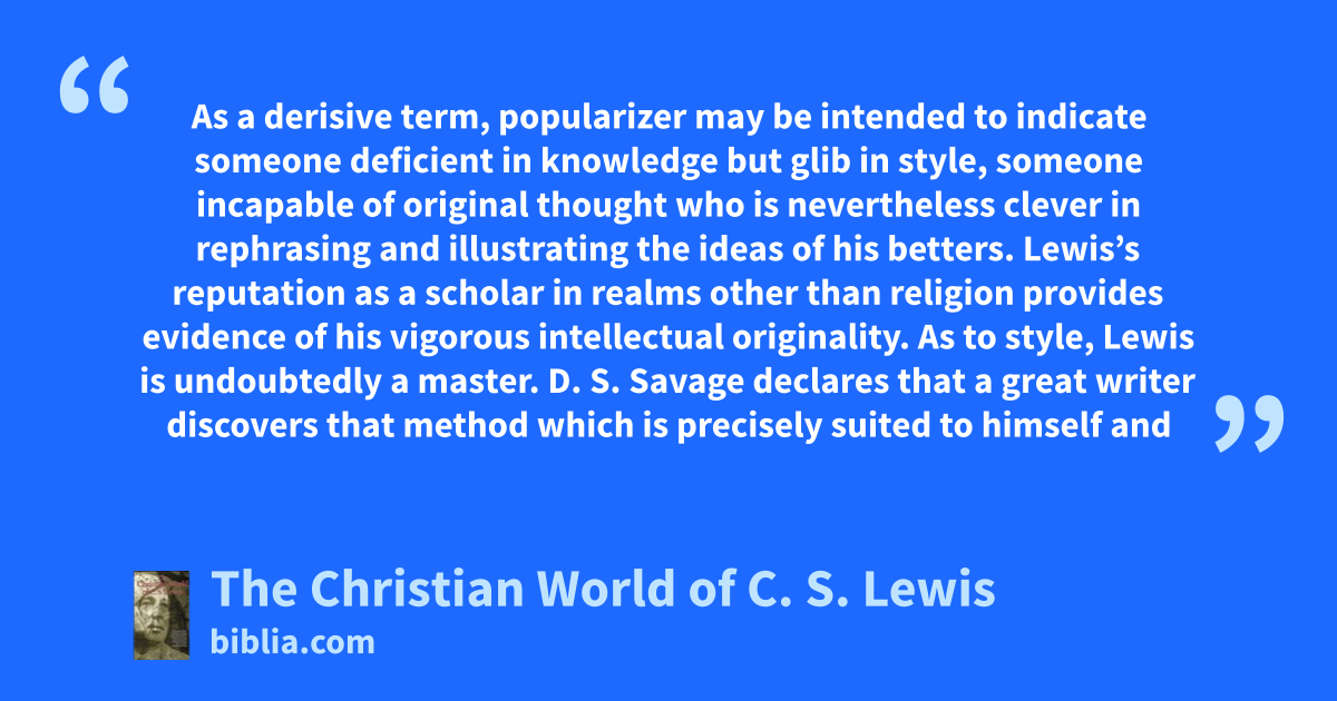 As a derisive term, popularizer may be intended to indicate someone deficient in knowledge but glib in style, someone incapable of original thought who is nevertheless clever in rephrasing and illustrating the ideas of his betters. Lewis’s reputation as a scholar in realms other than religion provides evidence of his vigorous intellectual originality. As to style, Lewis is undoubtedly a master. D. S. Savage declares that a great writer discovers that method which is precisely suited to himself and
