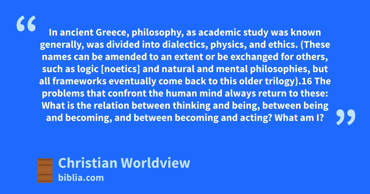In ancient Greece, philosophy, as academic study was known generally, was divided into dialectics, physics, and ethics. (These names can be amended to an extent or be exchanged for others, such as logic [noetics] and natural and mental philosophies, but all frameworks eventually come back to this older trilogy).16 The problems that confront the human mind always return to these: What is the relation between thinking and being, between being and becoming, and between becoming and acting? What am I?