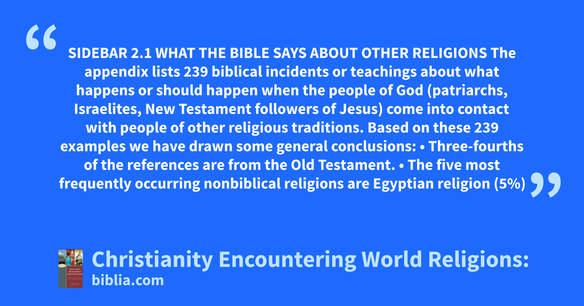 SIDEBAR 2.1 WHAT THE BIBLE SAYS ABOUT OTHER RELIGIONS The appendix lists 239 biblical incidents or teachings about what happens or should happen when the people of God (patriarchs, Israelites, New Testament followers of Jesus) come into contact with people of other religious traditions. Based on these 239 examples we have drawn some general conclusions: • Three-fourths of the references are from the Old Testament. • The five most frequently occurring nonbiblical religions are Egyptian religion (5%)