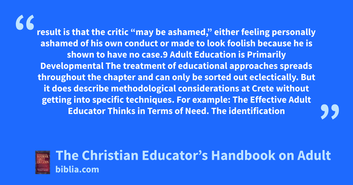 result is that the critic “may be ashamed,” either feeling personally ashamed of his own conduct or made to look foolish because he is shown to have no case.9 Adult Education is Primarily Developmental The treatment of educational approaches spreads throughout the chapter and can only be sorted out eclectically. But it does describe methodological considerations at Crete without getting into specific techniques. For example: The Effective Adult Educator Thinks in Terms of Need. The identification