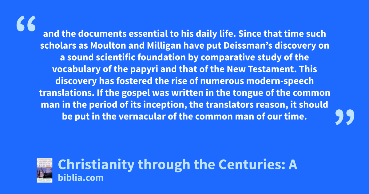 and the documents essential to his daily life. Since that time such scholars as Moulton and Milligan have put Deissman’s discovery on a sound scientific foundation by comparative study of the vocabulary of the papyri and that of the New Testament. This discovery has fostered the rise of numerous modern-speech translations. If the gospel was written in the tongue of the common man in the period of its inception, the translators reason, it should be put in the vernacular of the common man of our time.
