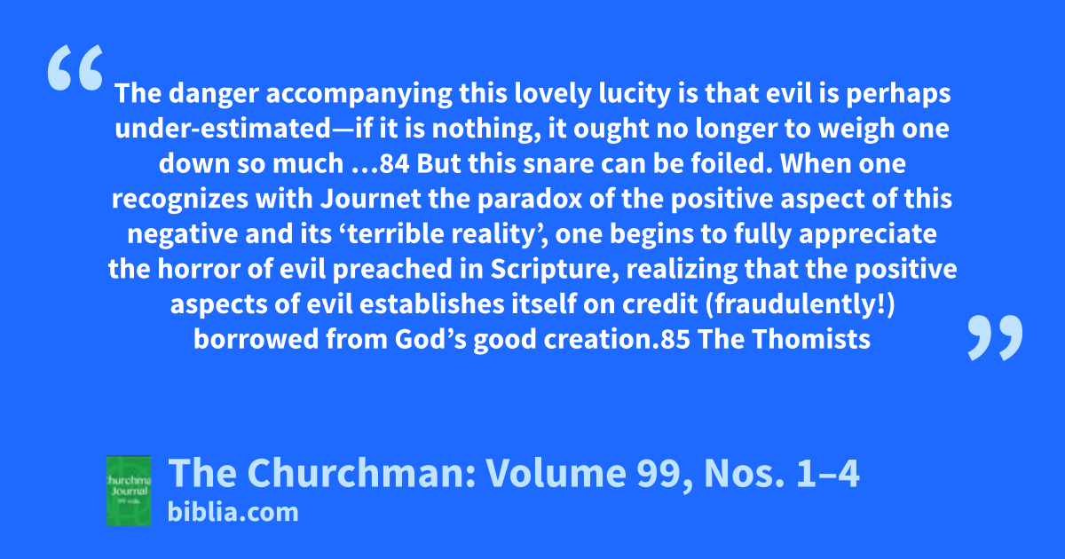 The danger accompanying this lovely lucity is that evil is perhaps under-estimated—if it is nothing, it ought no longer to weigh one down so much …84 But this snare can be foiled. When one recognizes with Journet the paradox of the positive aspect of this negative and its ‘terrible reality’, one begins to fully appreciate the horror of evil preached in Scripture, realizing that the positive aspects of evil establishes itself on credit (fraudulently!) borrowed from God’s good creation.85 The Thomists